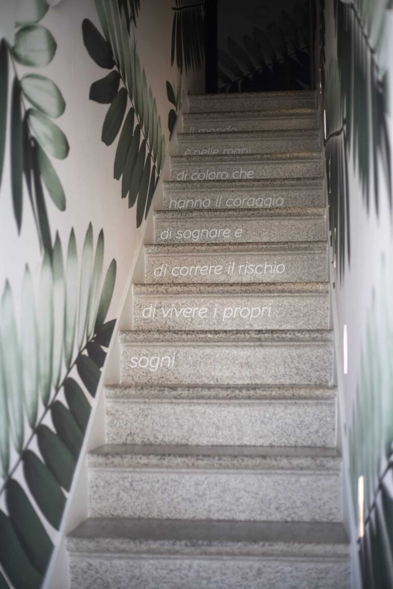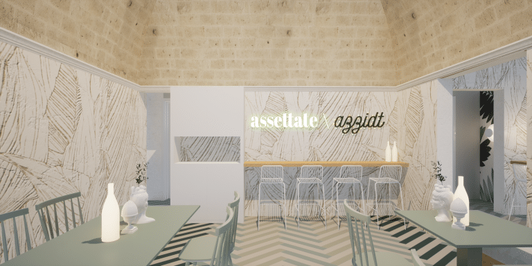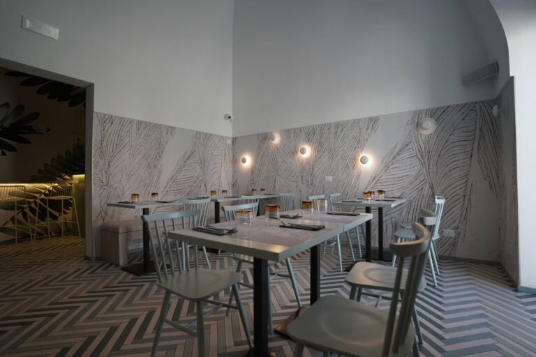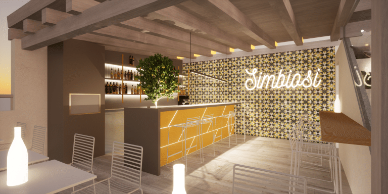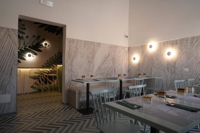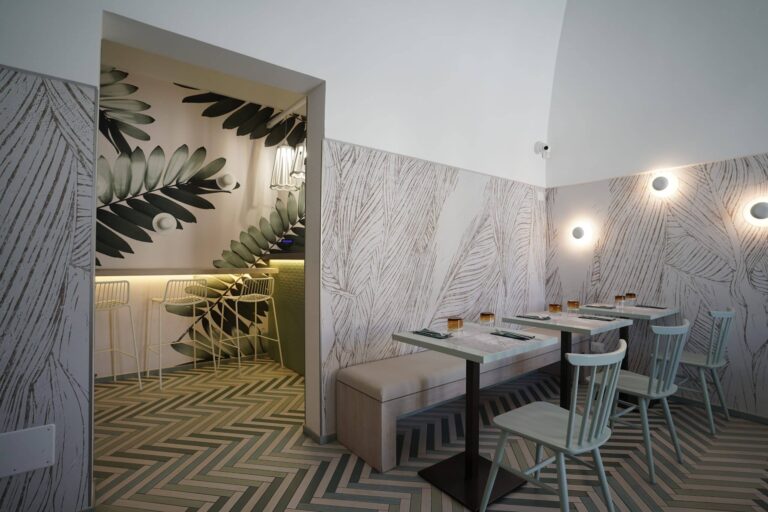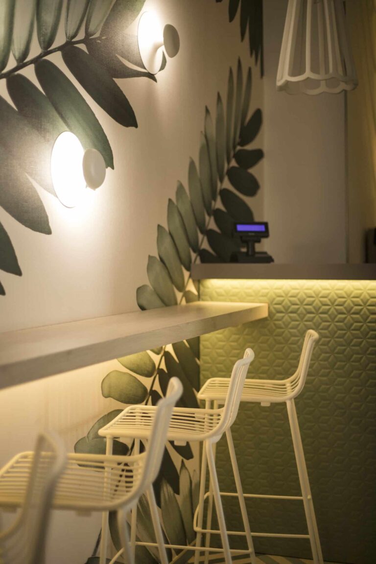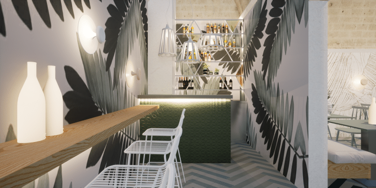 Un ambiente eclettico in cui tutto è disegnato con l’intento di avvolgere l’ospite in un’esperienza. Due banchi bar ideati in maniera differente : uno Total Yellow composto da forme geometriche romboidi retroilluminate vuole essere di rottura e taglio rispetto al passato. L’altro banco É invece pensato come un blocco verde la cui texture ricorda le ceramiche siciliane stilizzate ,integrato in un ambiente in cui delle maxi foglie d’ulivo accolgono e accompagnano, sin dalla scala d’accesso, punto di notevole “instragramabilita” con la sua frase ispirazionale posta sulle alzate “il mondo è nelle mani di coloro che hanno il coraggio di sognare e correre il rischio di vivere i propri sogni”.