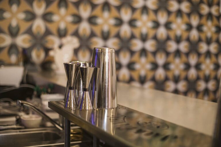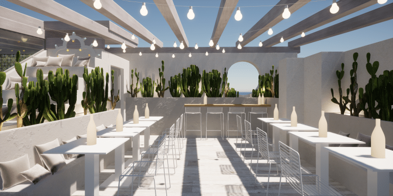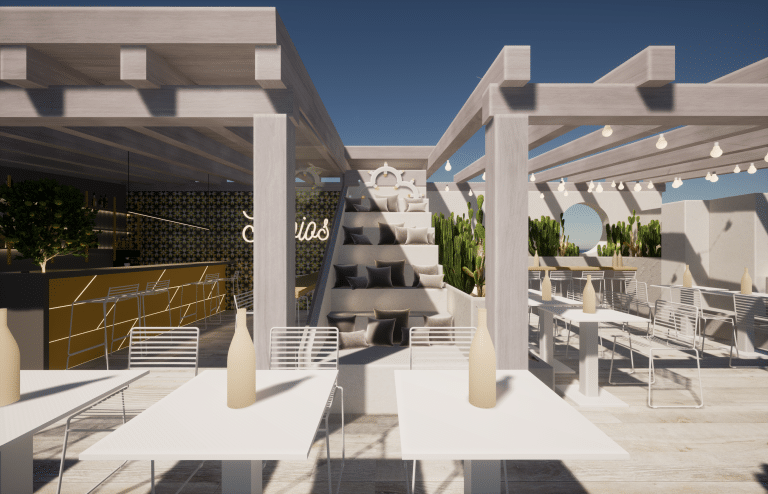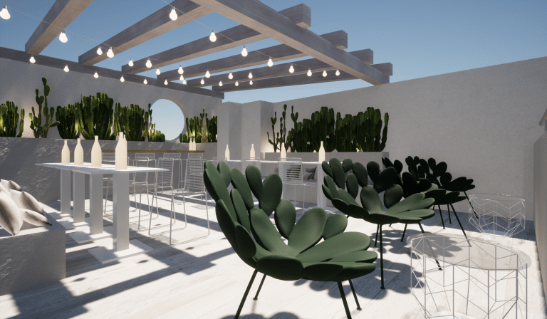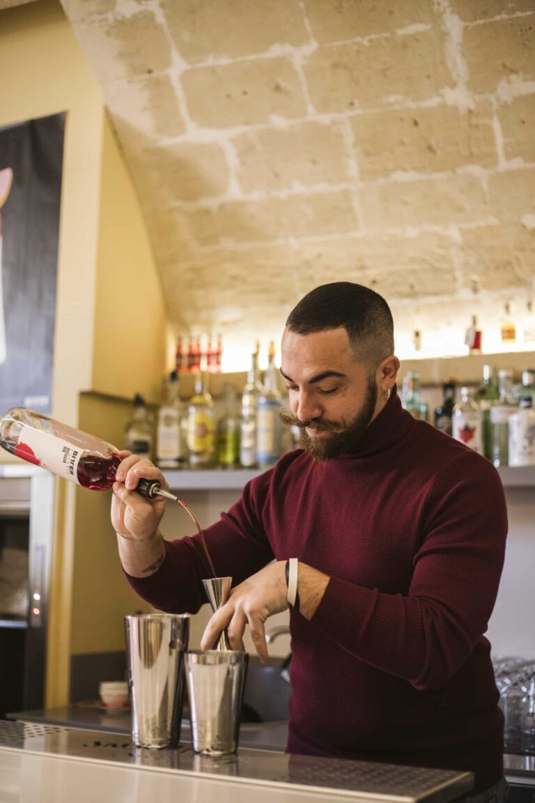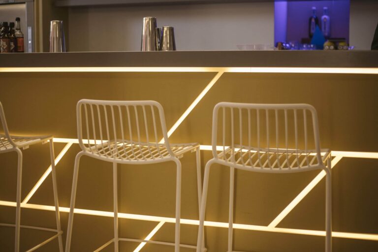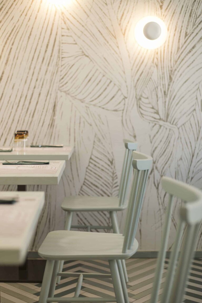 Un ambiente eclettico in cui tutto è disegnato con l’intento di avvolgere l’ospite in un’esperienza. Due banchi bar ideati in maniera differente : uno Total Yellow composto da forme geometriche romboidi retroilluminate vuole essere di rottura e taglio rispetto al passato. L’altro banco É invece pensato come un blocco verde la cui texture ricorda le ceramiche siciliane stilizzate ,integrato in un ambiente in cui delle maxi foglie d’ulivo accolgono e accompagnano, sin dalla scala d’accesso, punto di notevole “instragramabilita” con la sua frase ispirazionale posta sulle alzate “il mondo è nelle mani di coloro che hanno il coraggio di sognare e correre il rischio di vivere i propri sogni”.