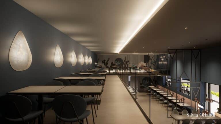 Il design di questo locale è essenziale e raffinato: tavoli minimali con struttura nera e top effetto marmo, sedute scultoree, toni blu profondi accostati a materiali morbidi e naturali. Un grande murale botanico e una zona relax con caminetto completano l’esperienza visiva. Per idee e soluzioni su come arredare un bar leggi il mio articolo qui
