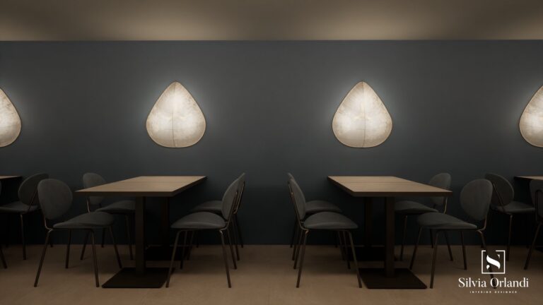 Dal punto di vista distributivo, l’ambiente si articola in due livelli: il piano terra è dinamico, luminoso e conviviale; il soppalco, più raccolto, invita alla contemplazione. Qui, le applique a forma di foglia, ispirate al mondo organico, diffondono una luce calda e avvolgente, rispettando la richiesta di illuminazione a parete, senza abbassamenti.