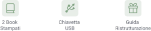 due book stampati (render e tavole tecniche), chiavetta USB con tutto il materiale digitale e una guida alla ristrutturazione che ti accompagna passo dopo passo.